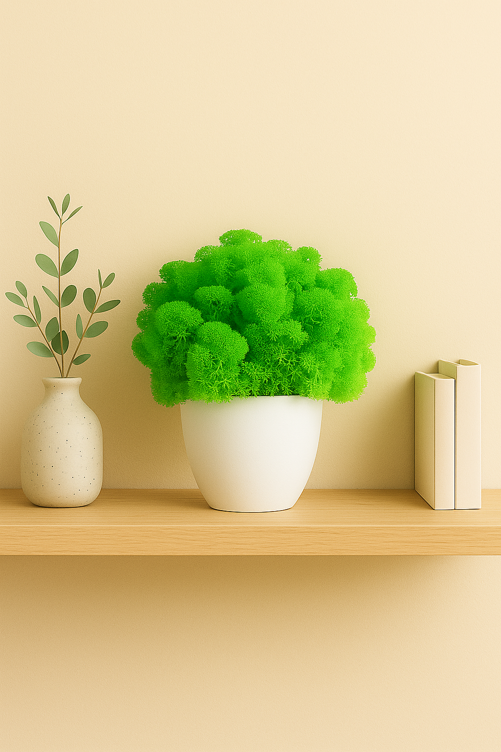 Naturalny, stabilizowany chrobotek reniferowy w matowej, białej doniczce (wys. 16 cm). Gotowy element zielonej dekoracji do salonu, biura lub przedpokoju. Nie wymaga podlewania ani doświetlania.
