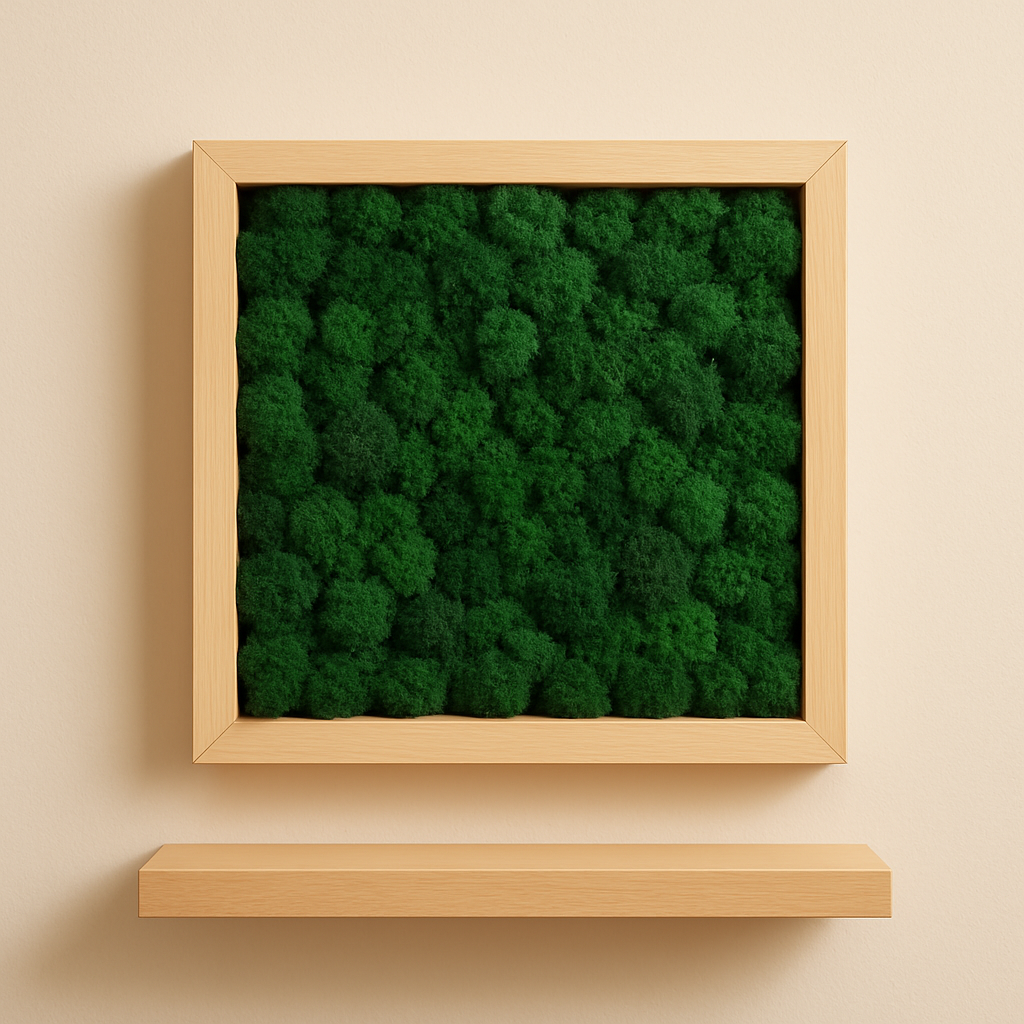 Obraz ścienny z naturalnym, stabilizowanym chrobotkiem reniferowym w odcieniu Zielonym, oprawiony w drewnianą ramę 30×30 cm. Nie wymaga podlewania ani światła, zachowuje kolor i miękkość przy wilgotności 40–70%. Delikatnie poprawia akustykę i wprowadza zieleń do salonu, sypialni, biura czy recepcji. Montaż na zawieszce; wyłącznie do wnętrz.