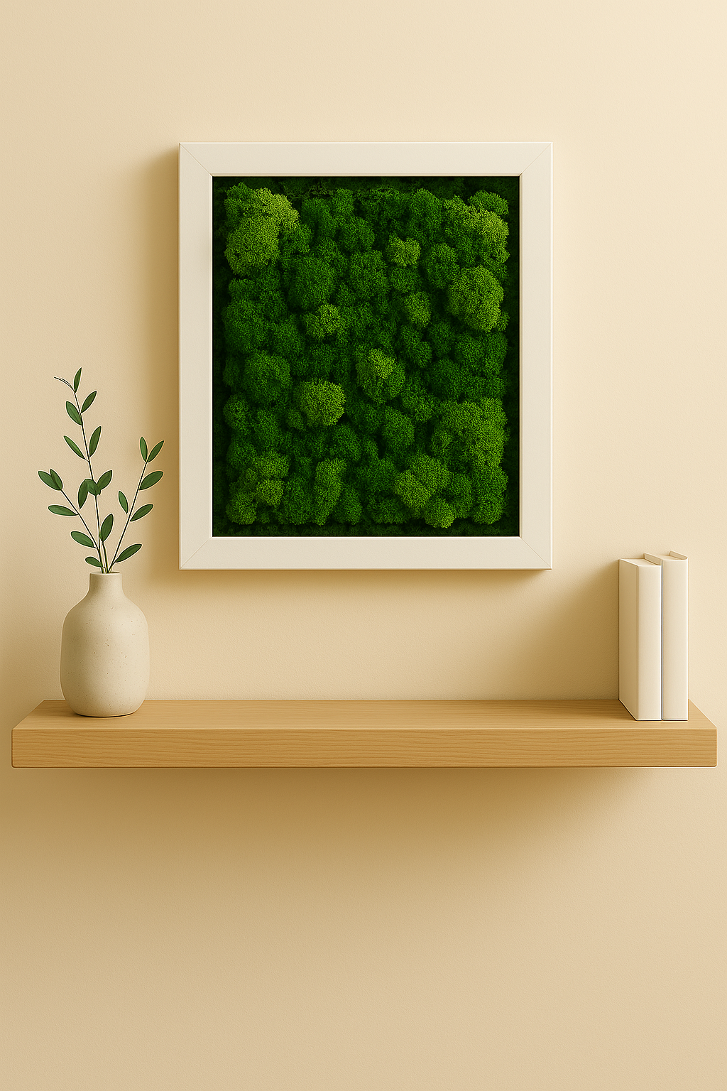 Dekoracyjny obraz z naturalnym, stabilizowanym chrobotkiem reniferowym w białej ramie. Format 15×21 cm idealny na półkę lub ścianę. Nie wymaga podlewania ani światła — zachowuje miękką fakturę i intensywną zieleń przez długi czas. Sprawdza się w salonie, biurze, korytarzu czy sypialni, dodając wnętrzu naturalny akcent i przyjemną głębię.